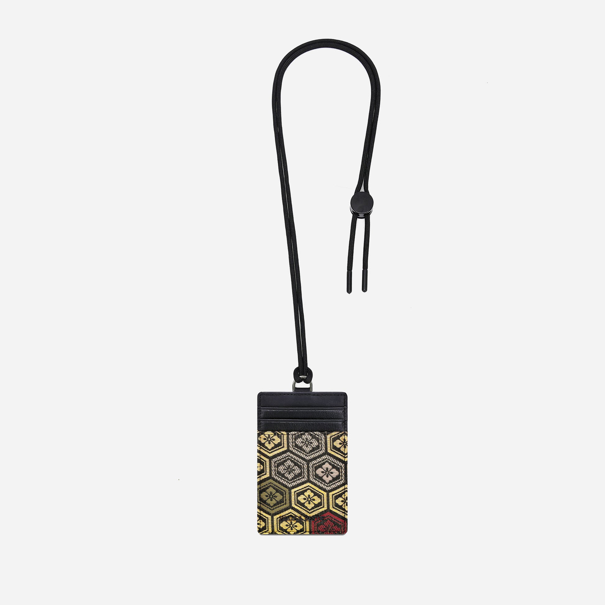 這款垂直卡片套採用奢華的日本西陣織和黑色小牛皮製成,一面設有三個卡片隔層,另一面則飾有透明證件相框。此卡片套設有可調節及可拆卸的束繩肩帶,可繞在頸項或扣在手袋上。