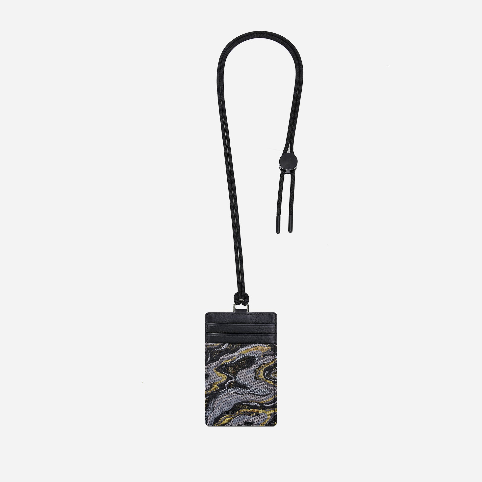 這款垂直卡片套採用奢華的日本西陣織和黑色小牛皮製成,一面設有三個卡片隔層,另一面則飾有透明證件相框。此卡片套設有可調節及可拆卸的束繩肩帶,可繞在頸項或扣在手袋上。