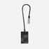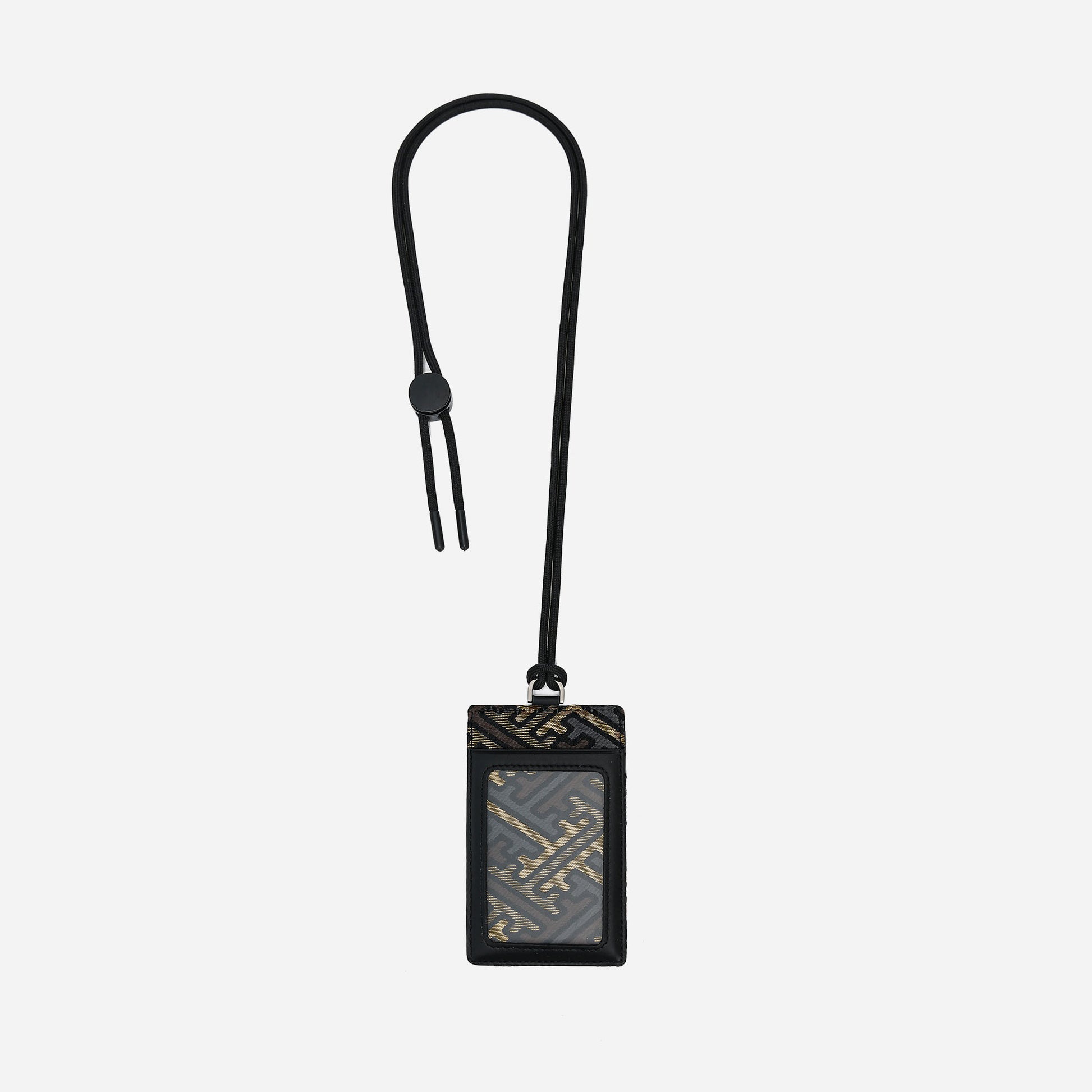這款垂直卡片套採用奢華的日本西陣織和黑色小牛皮製成,一面設有三個卡片隔層,另一面則飾有透明證件相框。此卡片套設有可調節及可拆卸的束繩肩帶,可繞在頸項或扣在手袋上。